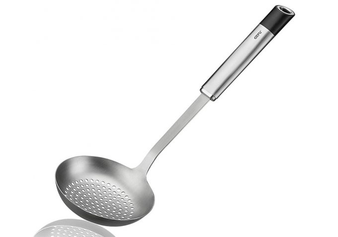 El cucharón perforado que veis en la primera imagen es de la firma alemana Gefu y le llaman espumadera, pues realmente puede cumplir más la función de la espumadera que, entre otras cosas, es servir los alimentos bien escurridos, y espumar o desespumar cuando se está cocinando, por ejemplo, un caldo. Seguramente el diseño os recordará a muchos a los clásicos cucharones para escurrir aceitunas, son similares, pero bastante más pequeños.