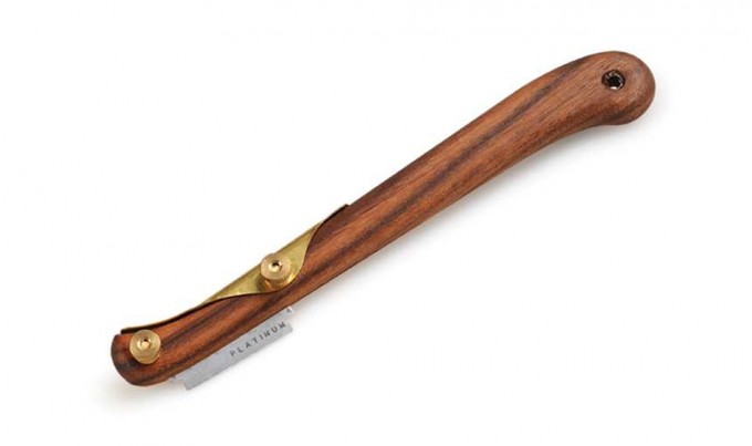 Es un lame de madera de nogal hecho a mano en Estados Unidos. Mide unos 19 centímetros de largo y como se puede apreciar en las fotos, tiene un sencillo sistema de tuercas para cambiar la cuchilla.