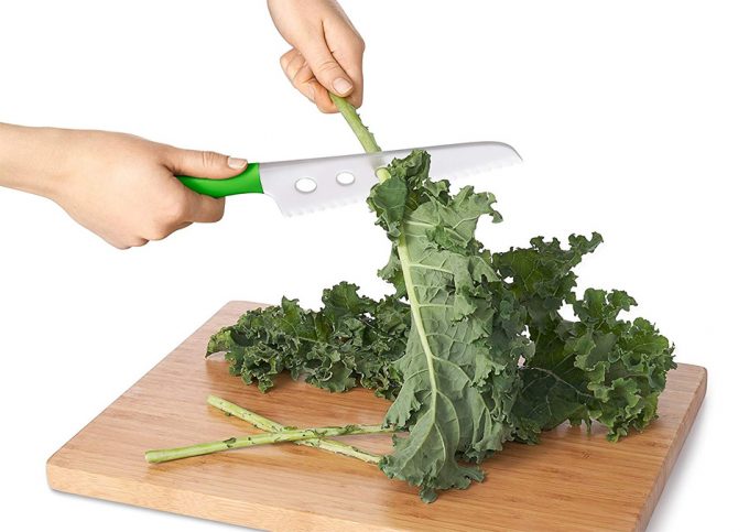 Oxo es el artífice de uno de los nuevos cuchillos para lechuga, es el que podéis ver en las fotos y como podéis apreciar, tiene dos funcionalidades, es un cuchillo deshojador, y esta función es especialmente para la col rizada o kale, así lo indica el fabricante y así es, porque pocas hojas de vegetales hay que tengan el mismo tipo de tallo y que se adapten a los orificios que tiene la hoja del cuchillo para deshojar.