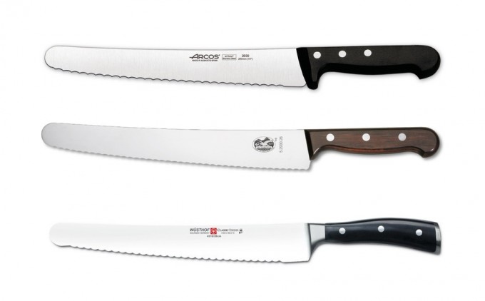Si os gustan los modelos de la foto que ilustra estas líneas, comentar que el primero es de Arcos y tiene una longitud de 25 centímetros, el mango de polioximetileno y un precio de unos 21 euros, el segundo es un Vitorinox con una hoja de 25’4 centímetros, mango de palo de rosa y un precio que ronda los 48 euros, y el tercero es un Wüsthof con una longitud de 26 centímetros, no especifica el material del mango y su precio supera los 90 euros.