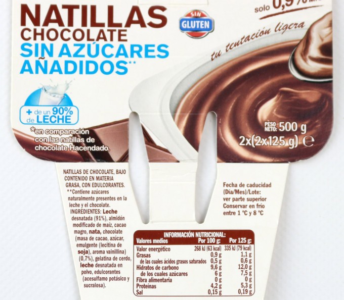 El pasado mes de septiembre, la Asociación de Usuarios de la Comunicación (AUC) presentó una reclamación en Autocontrol (Asociación para la Autorregulación de la Comunicación Comercial) contra Mercadona por el etiquetado de unas natillas con sabor a chocolate de la marca Hacendado por considerar que el mensaje “Sin azúcares añadidos” era fraudulento. Dicho etiquetado hace pensar al consumidor que el producto únicamente contiene azúcares que están presentes de forma natural en los ingredientes que lo componen, es decir, que tiene muy pocos azúcares o nada, sin embargo, en la etiqueta se puede leer que las natillas tienen 7’5 gramos de azúcar por cada 125 gramos de producto, y es que el chocolate presente en este postre es un chocolate procesado, por lo que los azúcares que contiene no están presentes de forma natural, sino que son azúcares añadidos.