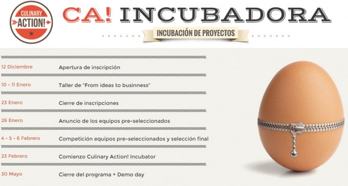 Culinary Action! Incubator (CA! Incubadora) ofrece un programa de 12 semanas en las que se ayudará a los emprendedores a hacer de su idea un proyecto real, es decir, a crear una start up, el inicio de un negocio. Este programa se desarrollará en 2015, pero el proceso de selección ya ha empezado, porque como os hemos comentado, están abiertas las inscripciones y el plazo finaliza el 23 de enero.