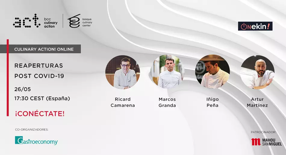 El caso es que hay asociaciones, instituciones y otras entidades que se han formado y volcado para luchar unidos por salir de esta crisis y por ofrecer todo tipo de recursos. De momento, podemos hablaros de una nueva cita virtual que ha organizado el Basque Culinary Center en el marco de su plataforma Culinary Action! que, como sabéis, suele ser una cita presencial en la que se reúnen profesionales y emprendedores del sector gastronómico para compartir experiencias y promover el debate a través de distintos casos de éxito que comparten los propios cocineros, hosteleros y empresarios.
