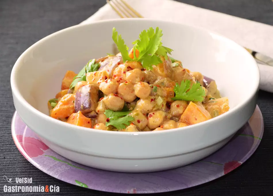 La receta de este curry con legumbres y verduras es muy fácil de hacer, y el tiempo de elaboración es relativamente corto, siempre que se tengan los garbanzos cocidos con antelación. Es ideal para tomar un plato único entre semana, cuando no se dispone de mucho tiempo ni para cocinar ni para deleitarse en la mesa, en cuanto al tiempo, porque en cuanto a la comida no hay excusa para disfrutar.