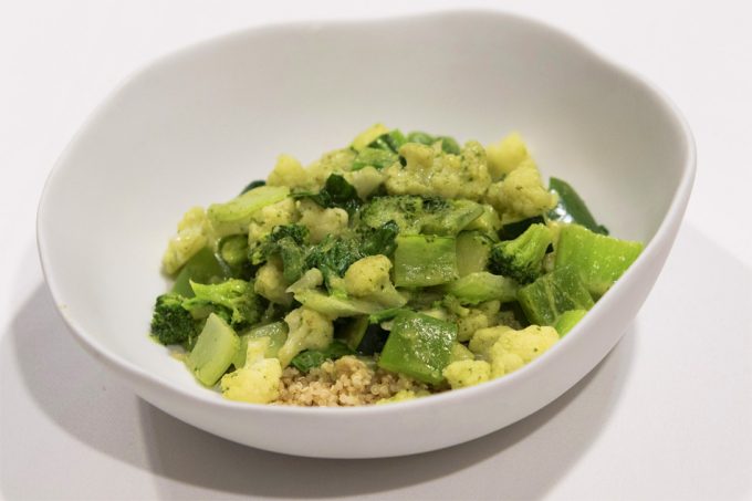 Curry verde con verduras asiáticas y quinoa blanca