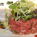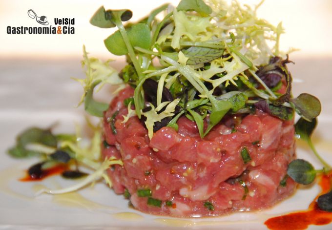 Corona el tartar con microensalada, un poco de aceite de pimentón de la Vera y acompaña con tostaditas y mantequilla, un buen tartar debe acompañarse de buen pan.