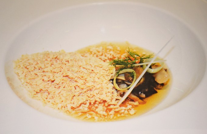 Disponer en el plato 4 dados de jengibre, 3 láminas de tallo de alcachofas, 2 láminas de juliana de puerro y 2 de cebolleta. Poner 60 gramos de foie rallado con un toque de pimienta de sichuan y sal Maldon, sin tapar la guarnición. Servir el caldo a temperatura 65º C aproximadamente.