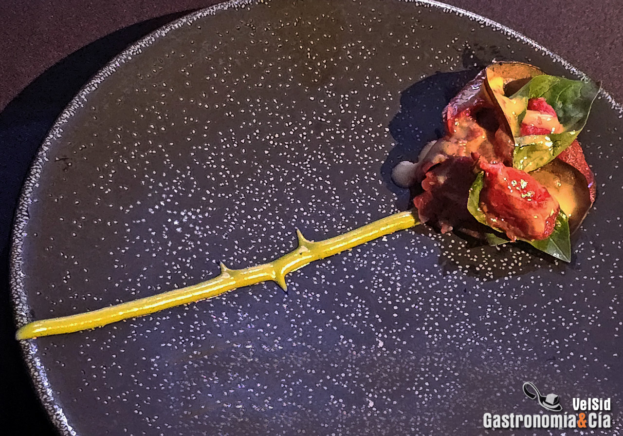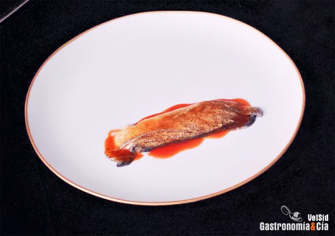 Para preparar la piel de bacalao, después de desescamarla se pone entre papel sulfurizado y se envasa para cocinar a 80º C durante una media hora. Esta piel se coloca en el plato sobre una brandada de bacalao tradicional, que se napa con el extracto de pimiento rojo. ¿Cómo se obtiene? Pues, después de asar los pimientos se dejan reposar al menos dos horas y después se estrujan. Imaginamos que algún ingrediente gelificante utilizarán para que tenga la textura que se aprecia, ¿podría ser xantana?