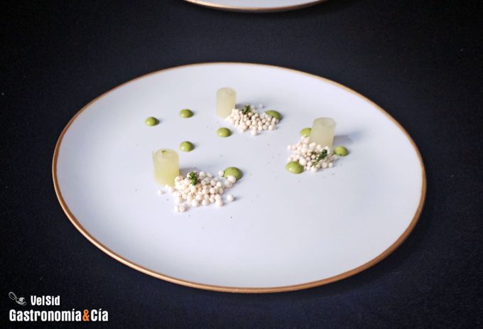 El origen de este plato vuelve a ser vegetal, el pepino se hace encurtido con vinagre de arroz, cebolleta, ajo, coriandro… Y se aprovecha la piel para hacer un polvo que también irá al plato, junto a las gotas verdes, que son una crema de ostras con perejil, y el queso de Roncal que se prepara a modo de shots, pequeñas bolitas congeladas que se funden en el paladar y gracias a la grasa láctea queda invadido de su sabor.