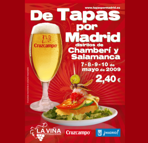 El próximo 7 de mayo comienza la segunda edición de la ruta gastronómica De Tapas por Madrid, un evento organizado por La Viña (Asociación Empresarial de Hostelería de la Comunidad de Madrid), el Ayuntamiento de Madrid y la marca de cervezas Cruzcampo, en el que se va a poder disfrutar de una cerveza y una tapa por un precio de 2,40 euros en todos los locales participantes de los distritos de Salamanca y Chamberí.