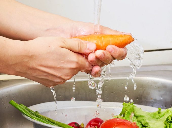 Lava las frutas y hortalizas crudas. Puedes utilizar agua con lejía apta para desinfección del agua de bebida (consultar la etiqueta), a razón de una cuchara de café bien colmada (1,2 a 2 ml) de lejía por litro de agua. Sumerge las frutas y hortalizas durante al menos 10 minutos y después realiza un enjuagado abundante con agua potable.