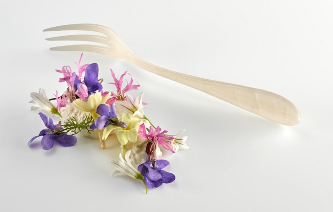 Servir una porción de mousse de anguila sobre un plato pequeño y disponer las hebras de carne y la piel de anguila encima. Cubrir con las flores y disponer el tenedor de azúcar en su recipiente para el servicio.