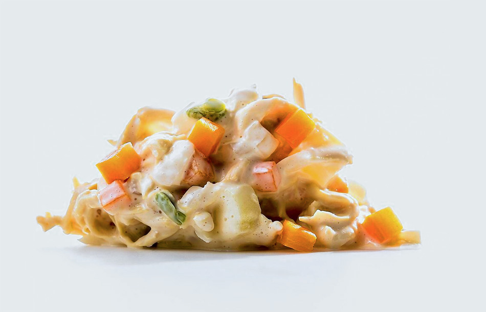 Retirar las pieles de la bolsa de vacío y estirar sobre una tabla. Cortar porciones del tamaño deseado y freír a 180º C. Reservar en un armario caliente.