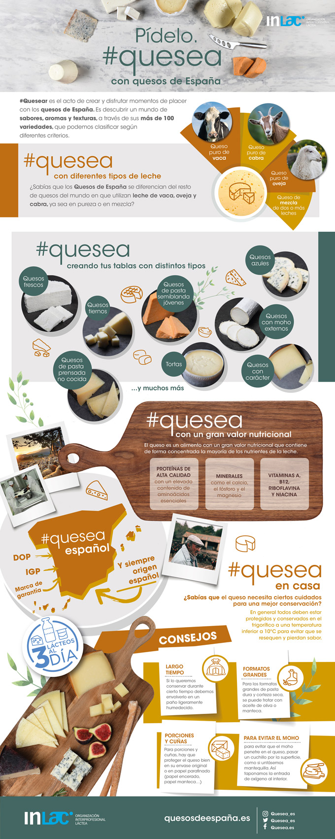 De este modo se aspira a potenciar su consumo, a que se descubra un mundo de sabores, aromas y texturas, porque en España se produce una gran variedad de quesos, frescos, curados, de pasta blanca, con mohos externos, con corteza lavada, con mohos internos… y de excelente calidad, INLAC sostiene que pocos países pueden presumir de tal variedad de quesos con o sin Denominación de Origen Protegida e Indicación de Origen Protegida.