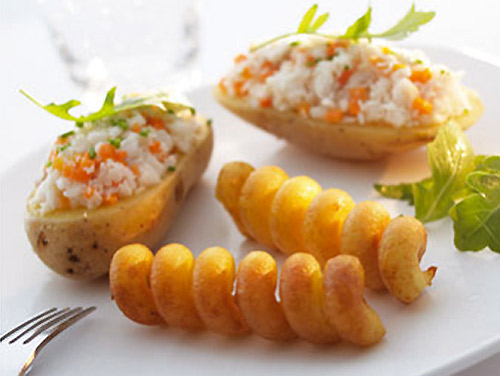 Quizá lo más fácil para empezar es hacerlo con patatas, por un lado obtendremos unas espirales que podremos freír y servir como decoración o guarnición de otros platos, y por otra dispondremos de unas patatas que podremos rellenar con carne (una forma diferente de hacer bombas), pescado o lo que se nos ocurra.