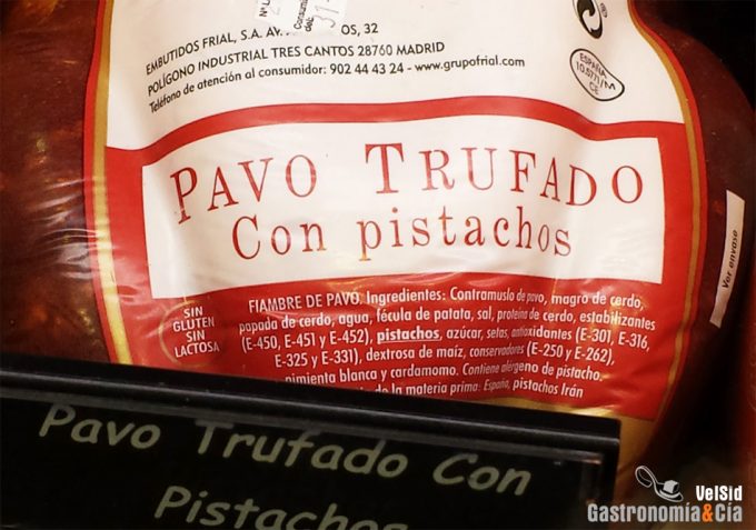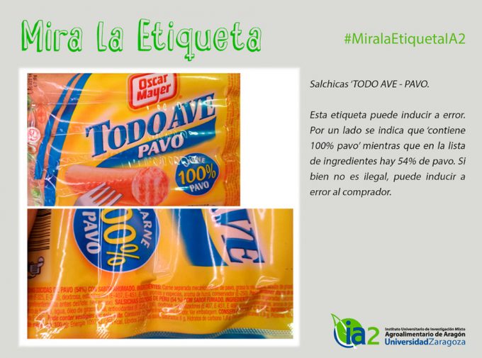 El primer ejemplo muestra, más que un error, una mala intención del fabricante de engañar al consumidor, pues en letras grandes se puede leer ‘Carne 100% pavo’, lo que hace creer que el producto es 100% carne de pavo, pero al comprobarlo en la lista de ingredientes se puede apreciar que sólo el 54% del producto es pavo, bueno, es carne de pavo separada mecánicamente (se obtiene de la carne que queda en las canales de animales una vez que se han eliminado los cortes principales), el resto es grasa de pollo, agua, sal, aceite de girasol, azúcares, conservantes, aromatizantes…