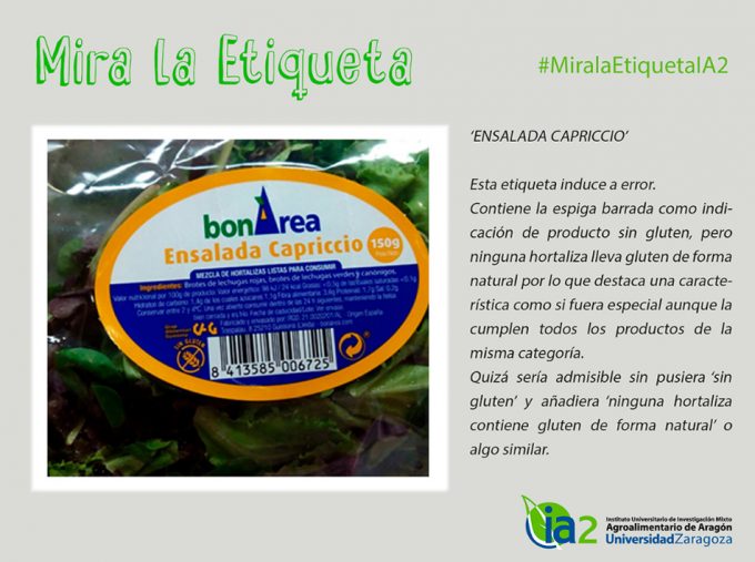 El segundo ejemplo está relacionado con el gluten, y es que, como sabemos, hay un ferviente interés en la sociedad de consumir productos sin gluten, además de que sigue aumentando el número de celíacos o intolerantes a dicha proteína, cuyo tratamiento consiste en consumir productos libres de gluten. Pues bien, hemos visto en infinidad de productos alimenticios que no contienen gluten de forma natural que portan el sello de la espiga y la leyenda ‘Sin gluten’, en este caso es una bolsa de ensalada o mezclum. Esto puede hacer creer a algunos consumidores que esta bolsa de ensalada (en este aspecto) es mejor que otras. Lo cierto es que este error en otros productos se ha excusado a menudo diciendo que, aunque sean alimentos que de forma natural no contengan gluten, de lo que se informa es de que no ha habido contaminación cruzada.
