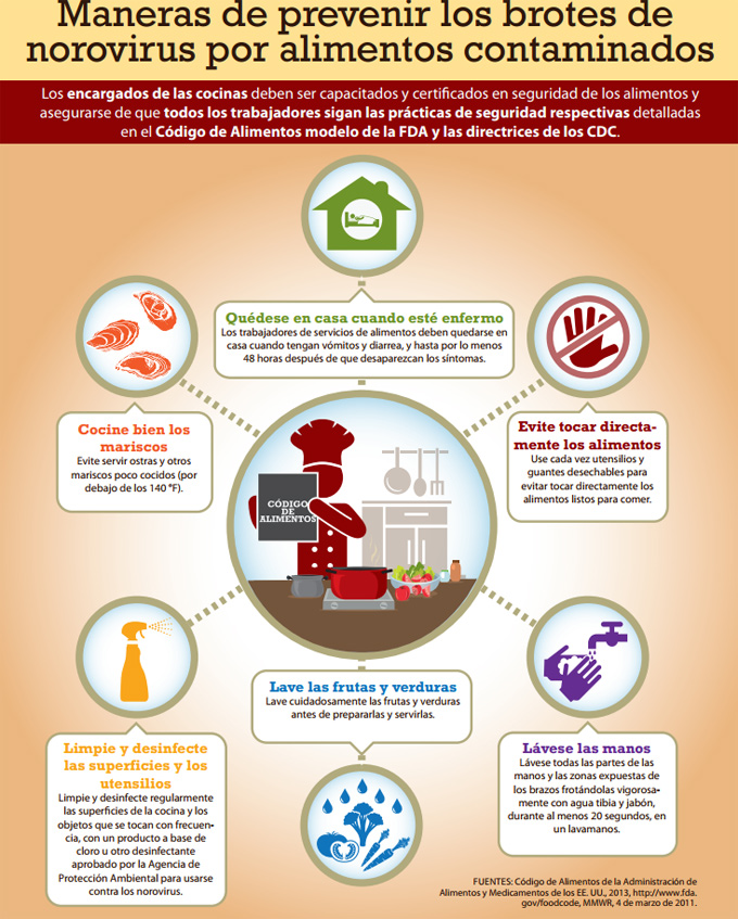 Se reconoce que para mejorar la seguridad alimentaria es necesario realizar una revisión de las prácticas higiénicas en la cocina, como limpiar los utensilios y superficies que entran en contacto con los alimentos, las normas de higiene personal a seguir, etc. Los Centros para el Control y la Prevención de Enfermedades (CDC), tras los oportunos estudios consideraron que la vía de transmisión más frecuente y causante de los brotes de norovirus era la manipulación de los alimentos por parte de los empleados de los establecimientos. A continuación podéis ver un gráfico en el que se recomiendan las prácticas higiénicas que debe seguir el sector a nivel nacional.