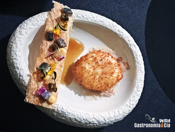 Esta sopa de ajo que tiene aspecto de una croqueta esférica, se acompaña de una crema de ajo negro fermentado y cebollino. Dicho sea de paso que el ajo fermentado lo elaboran en el restaurante con la OCCO, una olla de cocción coreana que cada vez está en más cocina creativas, pues con ella, cuya función combina diferentes técnicas culinarias controlando la temperatura y realizando una doble cocción a presión, consiguen transformar todo tipo de alimentos e ingredientes.