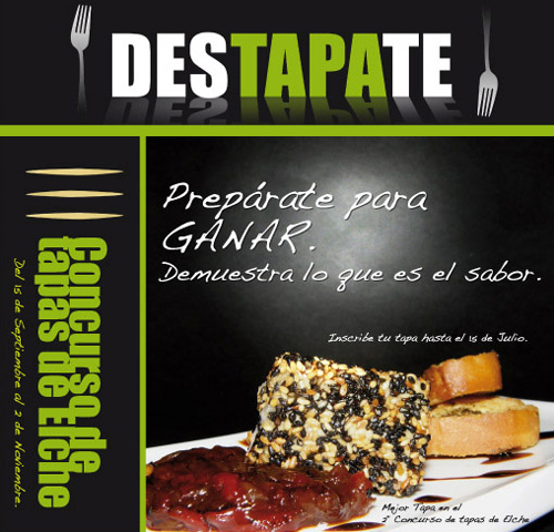 Del 22 de octubre al 19 de noviembre se celebra en la ciudad de Elche (Alicante) la octava edición del concurso de tapas Destapate 2012. Un año más, se convoca a los establecimientos para que participen en la promoción de gastronomía de la ciudad y convertirla en uno de los referente en el mundo de las tapas. Hasta el 16 de septiembre todos los bares y restaurantes de Elche que lo deseen, podrán inscribirse y presentar un máximo de dos tapas para participar en este certamen en el que deberán ofrecer cada tapa a un precio fijo, con IVA incluido, de 1’5 euros.