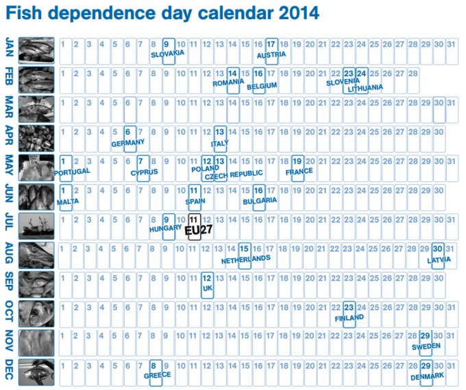 En este calendario también se establece un Día de Dependencia a nivel europeo, y está muy cercano al de hace dos años, en 2012 Europa dependía del pescado de terceros países el 6 de julio, en 2013 la fecha se establecía en el 6 de julio y este año a partir del día 11 del mismo mes se estará dependiendo del pescado de aguas extracomunitarias. No hay mejora en el grado de autosuficiencia, el grado de sobreexplotación continúa siendo elevado, como consecuencia, aproximadamente la mitad del pescado que se consume en la Unión Europea procede de aguas no comunitarias.