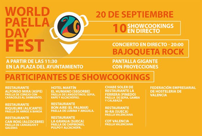 El 20 de septiembre nace el Día Mundial de la Paella (World Paella Day) con el objetivo de proporcionar un reconocimiento a uno de los platos más populares de la gastronomía española. Esta jornada que pretende recibir respuesta internacional y gozar de continuidad, ha sido impulsada por distintas entidades de la Comunidad Valenciana, como el Ayuntamiento de Valencia, Turismo Valencia, Federación Empresarial de Hostelería de Valencia, D.O. Arròs de Valencia, Wikipaella y el Concurso Internacional de Paella Valenciana de Sueca.