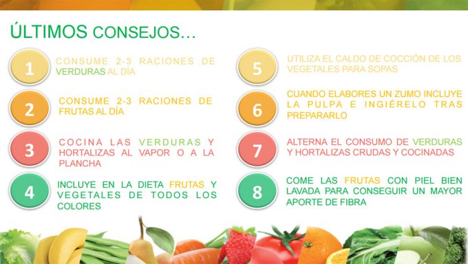 Luego pretenden ilustrar con algunos ‘últimos consejos’ recordando tomar dos o tres raciones de hortalizas y dos o tres raciones de frutas al día, que las hortalizas se cocinen a la plancha o al vapor y que se utilice el caldo de cocción de los vegetales para sopas. Pero si se hacen a la plancha o al vapor, ¿dónde está el caldo? En lugar de recomendar que se coma la fruta a bocados, indican que cuando se hagan zumos (no ‘si se hacen zumos’), dando por hecho que se puede consumir la fruta en forma de zumo, se incluya la pulpa porque contiene la fibra, y añaden ‘ingiérelo tras prepararlo’.