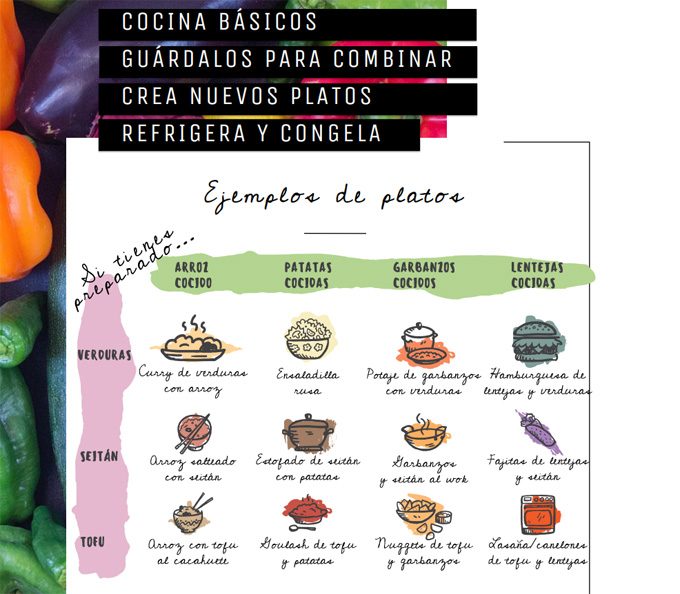Por cierto, si os estáis preguntando qué significa eso de ‘batch cooking’, consiste en planificarse y cocinar más cantidad para no tener que cocinar otro día, como bien dicen en el libro, lo que se ha hecho toda la vida, hacer comida de sobra para guardar, pero ahora tiene un nombre más cool. En cuanto a las recetas, hay muy buenas propuestas para toda la familia. Recordad que este recurso no es sólo para veganos, también para omnívoros o vegetarianos que quieran disfrutar de nuevos platos y reducir el consumo de productos de origen animal.