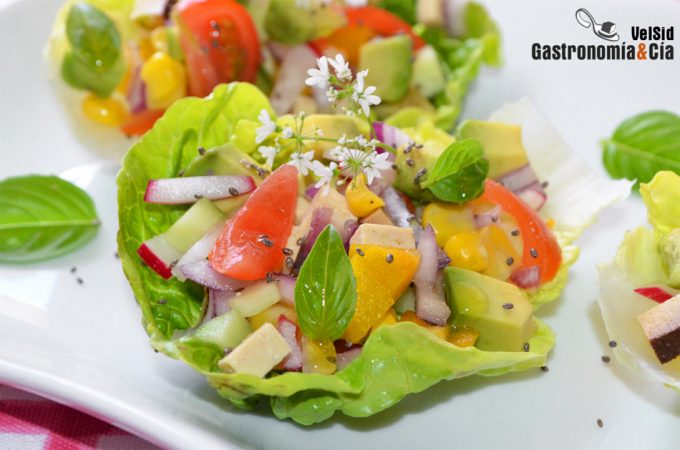 Tacos de lechuga con tofu ahumado, aguacate y vinagreta de sésamo