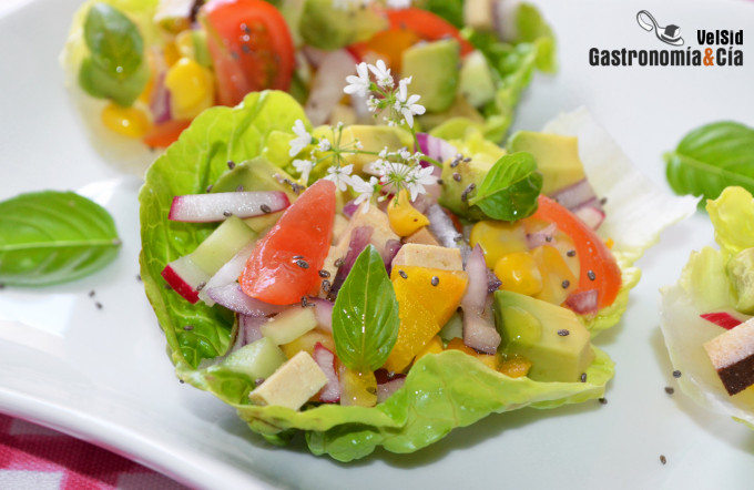 Tacos de lechuga con tofu ahumado, aguacate y vinagreta de sésamo