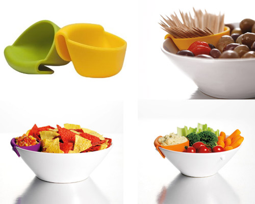 No es que sea lo más apropiado, pero cuántas veces nos haría más cómodo el picoteo en el sofá. Como veis, estos pequeños recipientes de silicona se colocan en el borde del cuenco, manteniendo en el interior el contenedor, el asa tiene suficiente resistencia para soportar el peso de la salsa o dip que se desee servir.