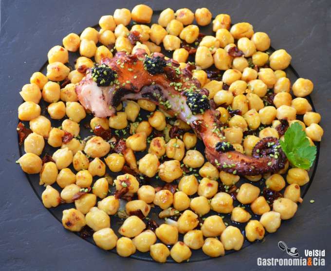 Garbanzos salteados con tomates secos y pulpo a la parrilla