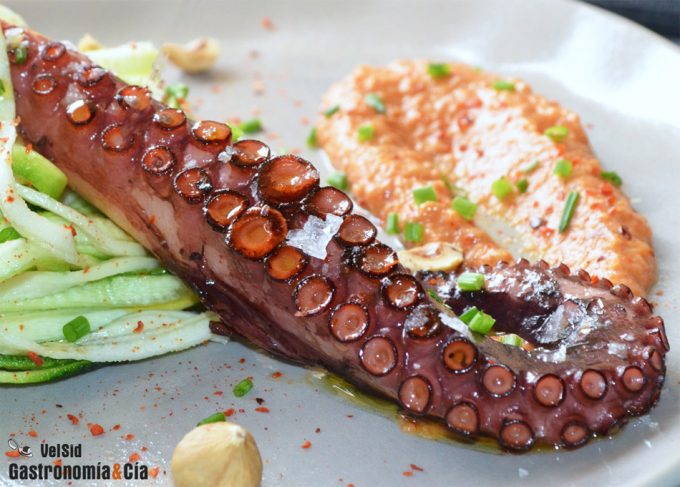 Espaguetis de calabacín con pulpo a la parrilla y salsa romesco
