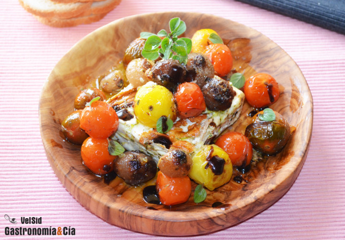 Queso feta a la plancha con tomatitos y cebollitas a la brasa