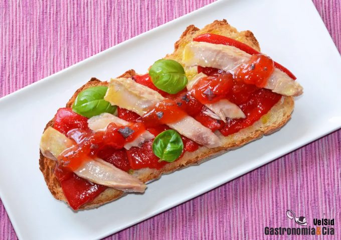 Tosta de pimientos del piquillo, ventresca de atún y mermelada de tomate