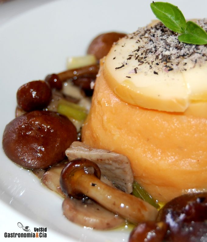 Crema de boniato con confitura de boletus, avellanas y rúcula crujiente