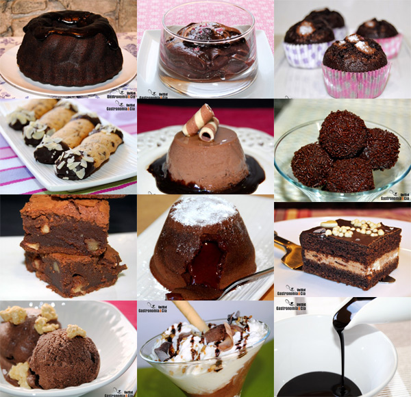 Las recetas con chocolate que os proponemos son las siguientes, podéis acceder a la explicación y fotos de cada una de ellas pulsando sobre su nombre, ya sabéis además que la imagen superior presenta una miniatura de la receta en el mismo orden que el listado, así las podéis elegir por la presentación o por el dulce que os apetezca hacer.