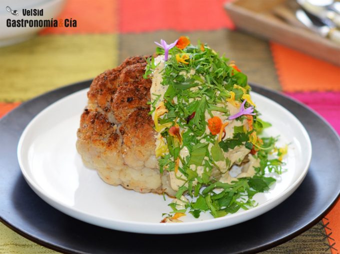Foto | La Tierra. Coliflor asada entera con salsa de sésamo y mostaza y hierbas aromáticas