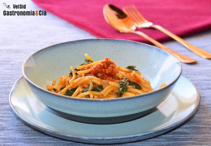Fideos a la cazuela con espinacas y sobrasada