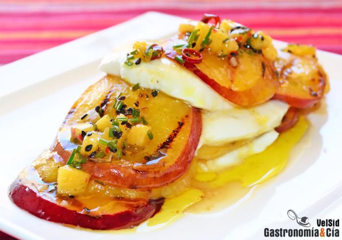 Mozzarella con melocotón a la parrilla y su vinagreta