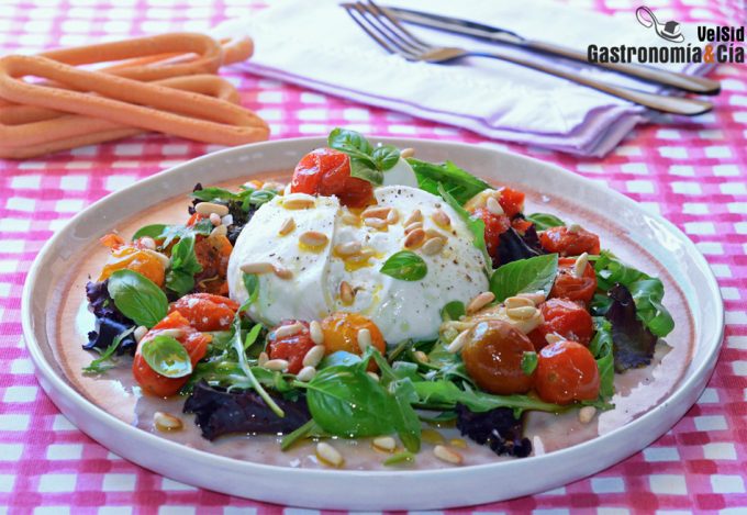 Ensalada de burrata con tomates confitados y piñones