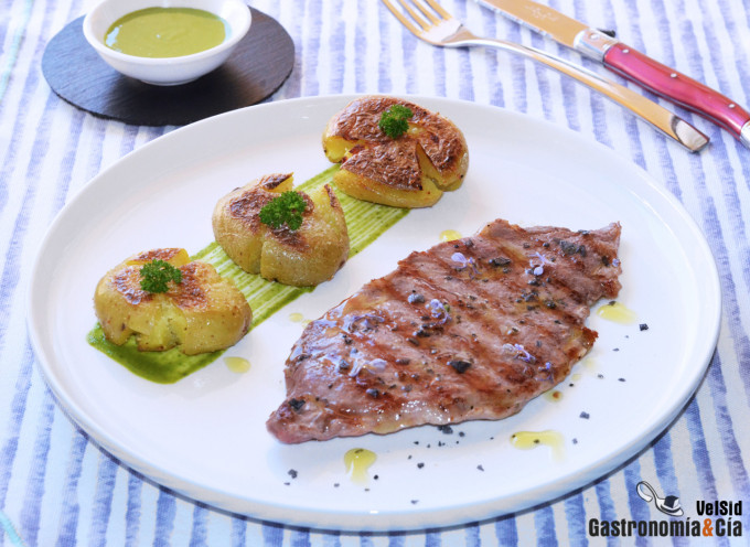 Presa de cerdo ibérico con patatas baby crujientes y salsa de perejil