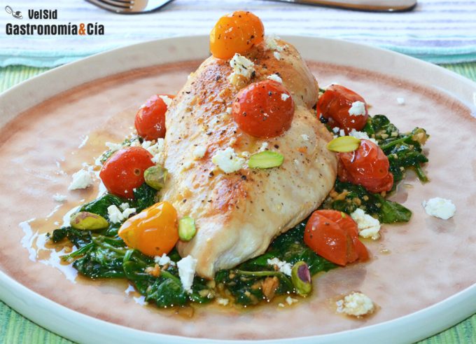 Foto | Pollo a la plancha con espinacas frescas y tomates confitados