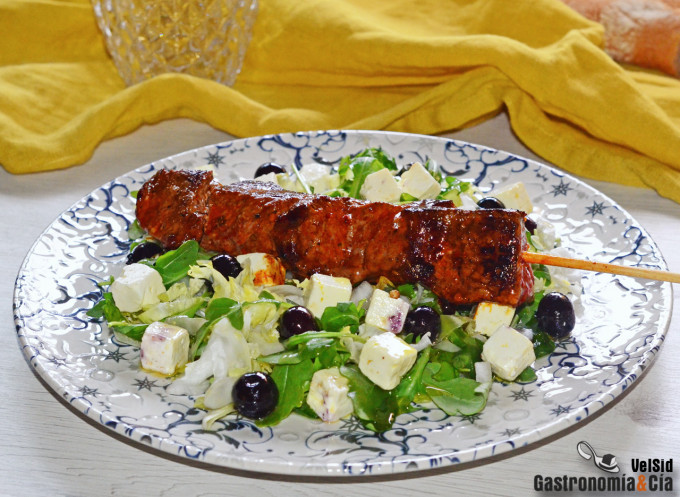 Brochetas de ternera con ensalada de rúcula, feta y arándanos