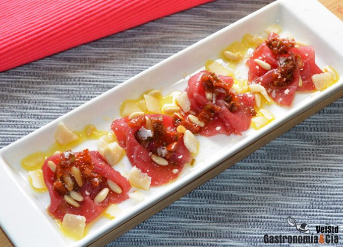 Carpaccio de buey con vinagreta de tomate seco y piñones