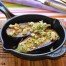 Coca de berenjena con ajo asado y sepionets: Aprovechando restos de masa de pan podemos hacer este aperitivo, una crujiente base de pan cubierta con berenjena y ajo asado, un poco de sepia y huevas. Una combinación de lujo.