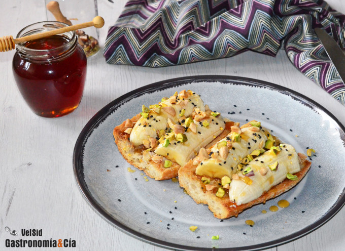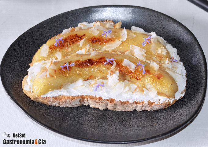Tostada de plátano, labneh y salsa de caramelo y avellana