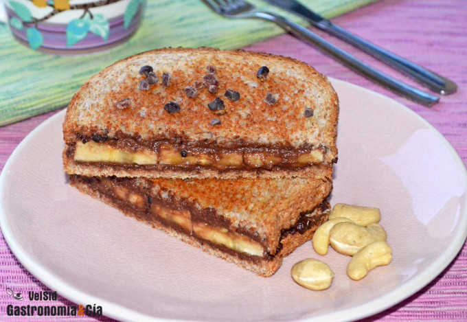 Sándwich tostado de crema de cacao y anacardos con plátano
