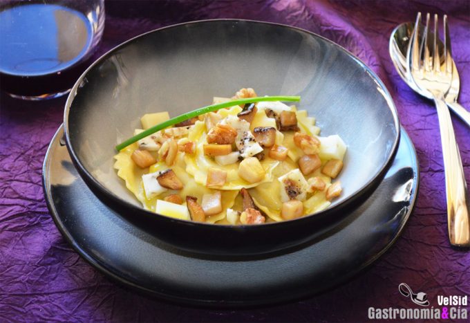Ravioli de queso y trufa con Pecorino trufado y setas de cardo