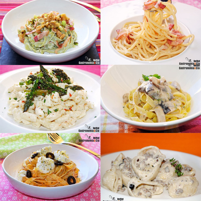 Hay recetas en las que puede haber un poco de salsa de tomate para dar un poco de color o sabor al plato, pero como os indicaremos, puede hacerse la misma salsa sin el tomate. También queremos comentaros que aunque en las recetas os indiquemos un tipo de pasta, podéis cambiarla al gusto, las pastas largas o cortas que más os gusten o que tengáis en vuestra despensa serán igualmente válidas para hacer estos platos.